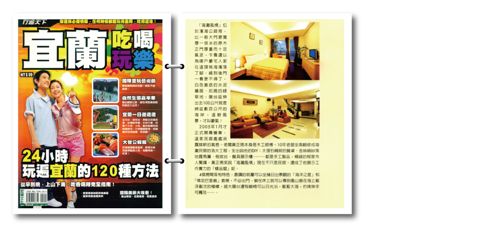 海灘風情位於濱海公路旁,比一般大門更寬厚一倍半的原木正門 厚重而十足氣派,乍看還以為哪戶豪宅人家在這頭城海濱落了腳 ;繞到後門一看更不得了,白色基底的水泥牆面、如茵的綠草地 ,陽台延伸出去 100 公尺就是綿延數百公尺的海岸,這般風景, 才叫豪氣! 2005 年 1月才正式開幕營業,這家民宿處處流露簇新的氣息。老 闆黃正男本身是木工師傅,10年老屋全面翻修成海灘民宿的浩大 工程,全出自他的 DIY ;大理石精砌的餐桌、金絲絹紗落地羅馬 簾、梳妝台、餐具展示櫃...都是手工製品,還成了他展示工 作實力的「樣品屋」呢。 4 個房間各特色,最讚的就屬可以坐擁日出景觀的「 海洋之星 」 和「情定巴里島」套房,不必出門,躺在床上就可以看到龜山島 在海上載浮載沈的模樣,超大陽台還有躺椅可以日光浴,藍藍大 海,彷彿伸手可觸及...。