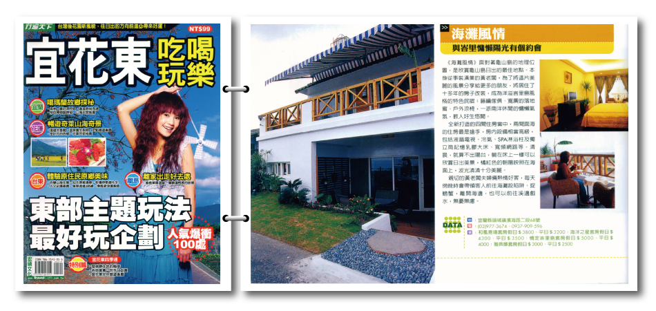 海灘風情面對著龜山島的地理位置,是欣賞龜山島日出的最佳地 點。本身從事裝潢業的黃老闆,為了將這片美麗的風景分享給更 多的朋友,將居住了十多年的房子改裝,成為洋溢峇里島風格的 特色民宿;籐編家具、寬廣的落地窗、戶外涼椅,一派南洋休閒 的慵懶氣氛,教人好生悠閒。 全新打造的四間住房當中,兩間面海的住房最是搶手,房內設備相當高級,包括液晶電視、冷氣、SPA 淋浴 柱及獨立筒記憶乳膠大床、寬頻網路等。清晨,就算不出陽台,躺在床上一樣可以欣賞日出美景,橘紅色的 朝陽映照在海面上,波光潾潾十分美麗。親切的黃老闆夫婦倆熱情好客,每天傍晚時會帶領客人前往海灘設 陷阱、捉螃蟹;離開海邊,也可以前往溪邊戲水,無憂無慮。